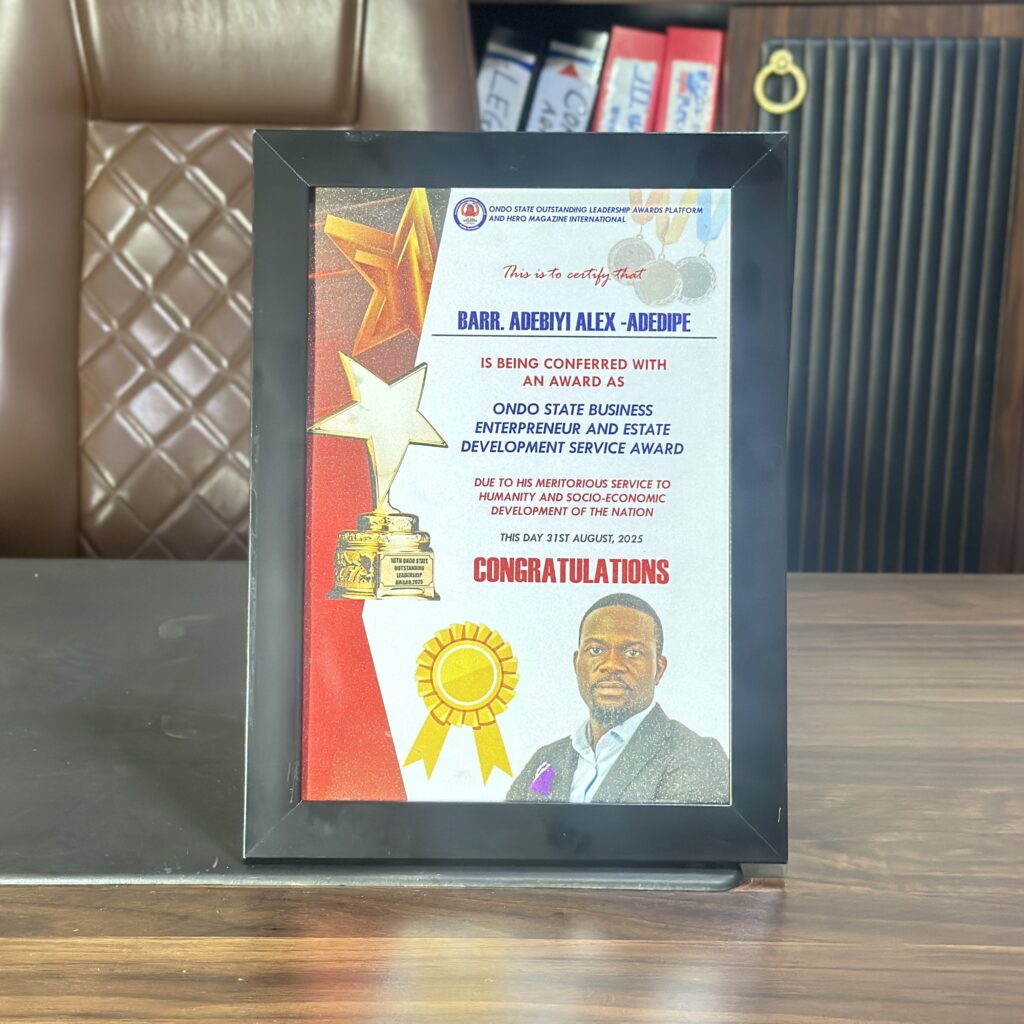 In recognition of this commitment, our Managing Director, Barr. Adebiyi Alex-Adedipe, was recently honored with the Ondo State Business Entrepreneur and Estate Development Service Award on August 31st, 2025.